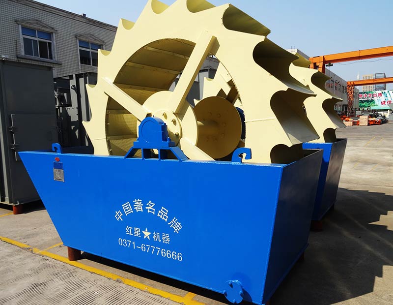 洗砂機(jī)工作時,電機(jī)通過三角帶、減速機(jī)、齒輪減速后帶動葉輪緩慢轉(zhuǎn)動,砂石由給料槽進(jìn)入洗槽中,然后在葉輪的帶動下翻滾,并互相研磨,除去覆蓋砂石表面上的雜質(zhì),同時破壞包覆砂粒的水汽層,以利于脫水;然后同時加水,形成強(qiáng)大的水流,及時將雜質(zhì)及比重小的異物帶走,并從溢出口洗槽排出,完成清洗作用。干凈的砂石由葉片帶走,最后砂石從旋轉(zhuǎn)的葉輪倒入出料槽,完成整個砂石的清洗作用。