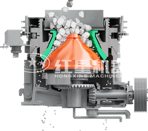 液壓圓錐破碎機工作時,偏心軸上的動錐在電動機的帶動下不停地周期性的擺動,使得動錐和靜態(tài)錐之間的距離不斷的發(fā)生變化,物料從進料口進入破碎腔后受到動錐和靜錐的擠壓后破碎,經(jīng)過多次的擠壓破碎達到要求粒度后從出料口排出。